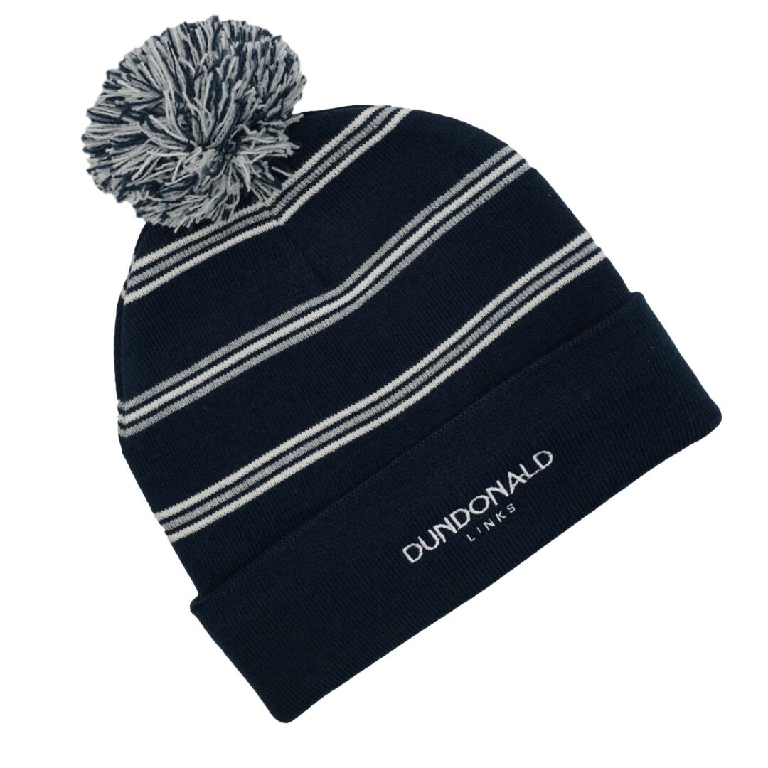 Knitted pull on hat, fleece lining, striped pattern and pom pom.