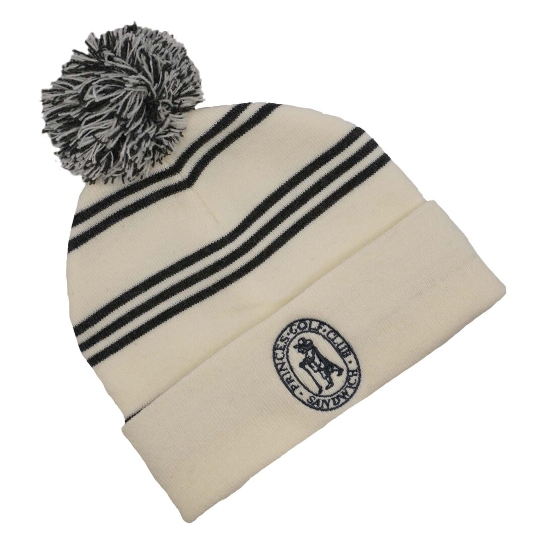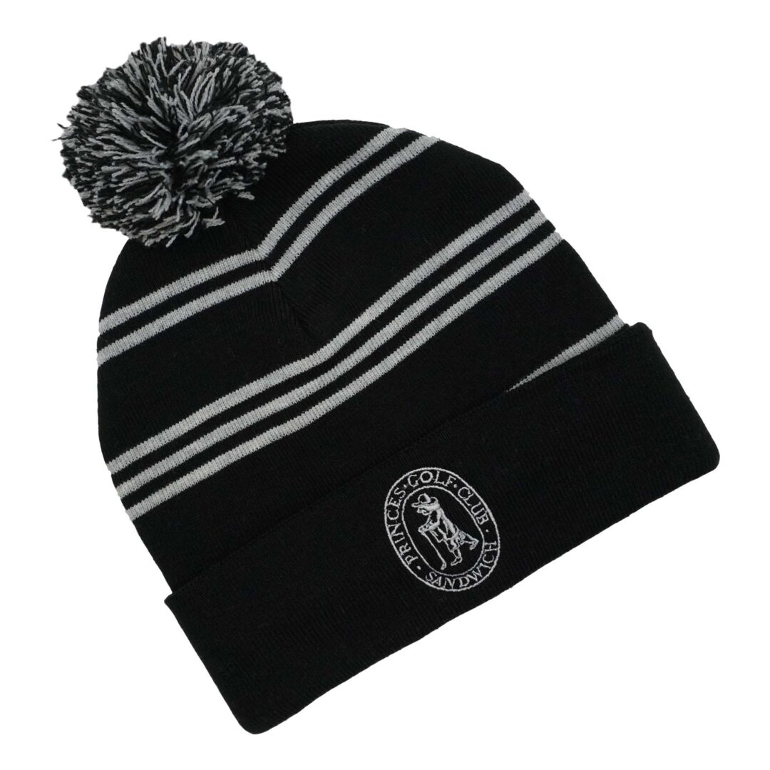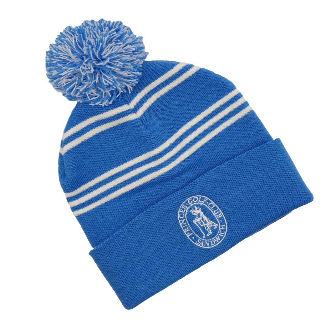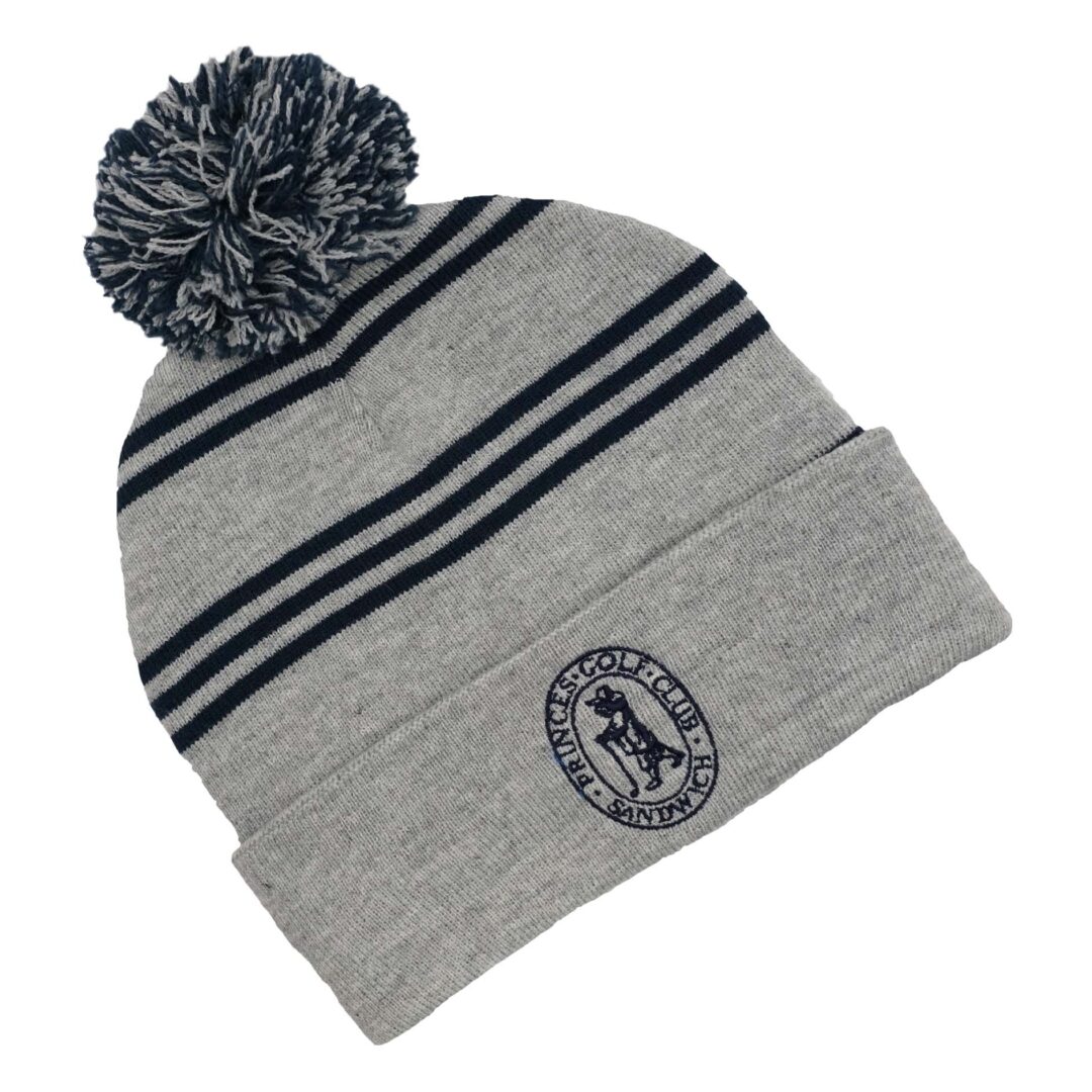 Knitted pull on hat, fleece lining, striped pattern and pom pom.