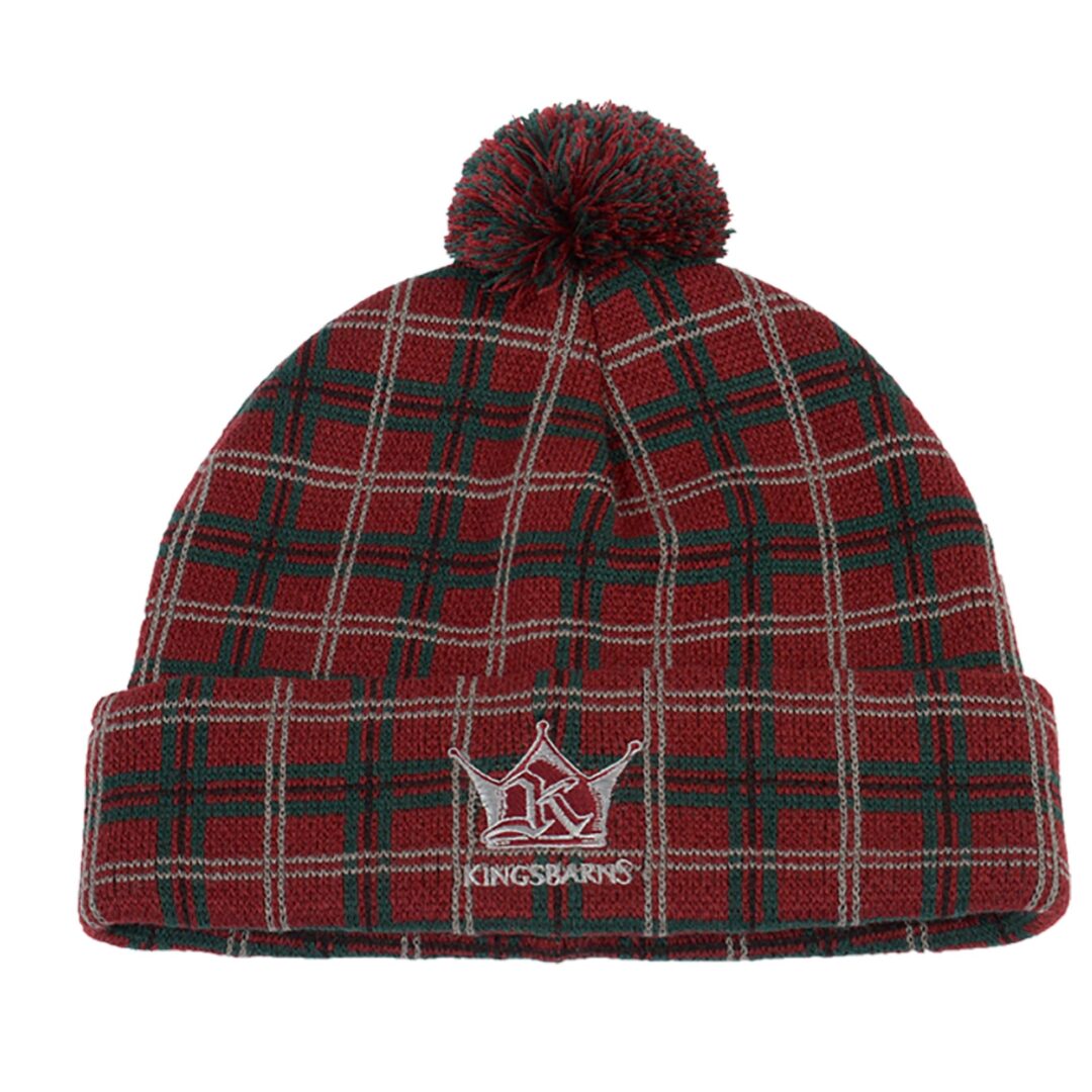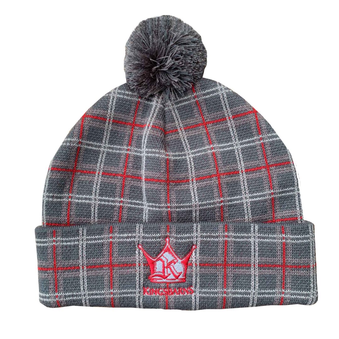 Knitted pull on hat, fleece lining, checked pattern and pom pom.